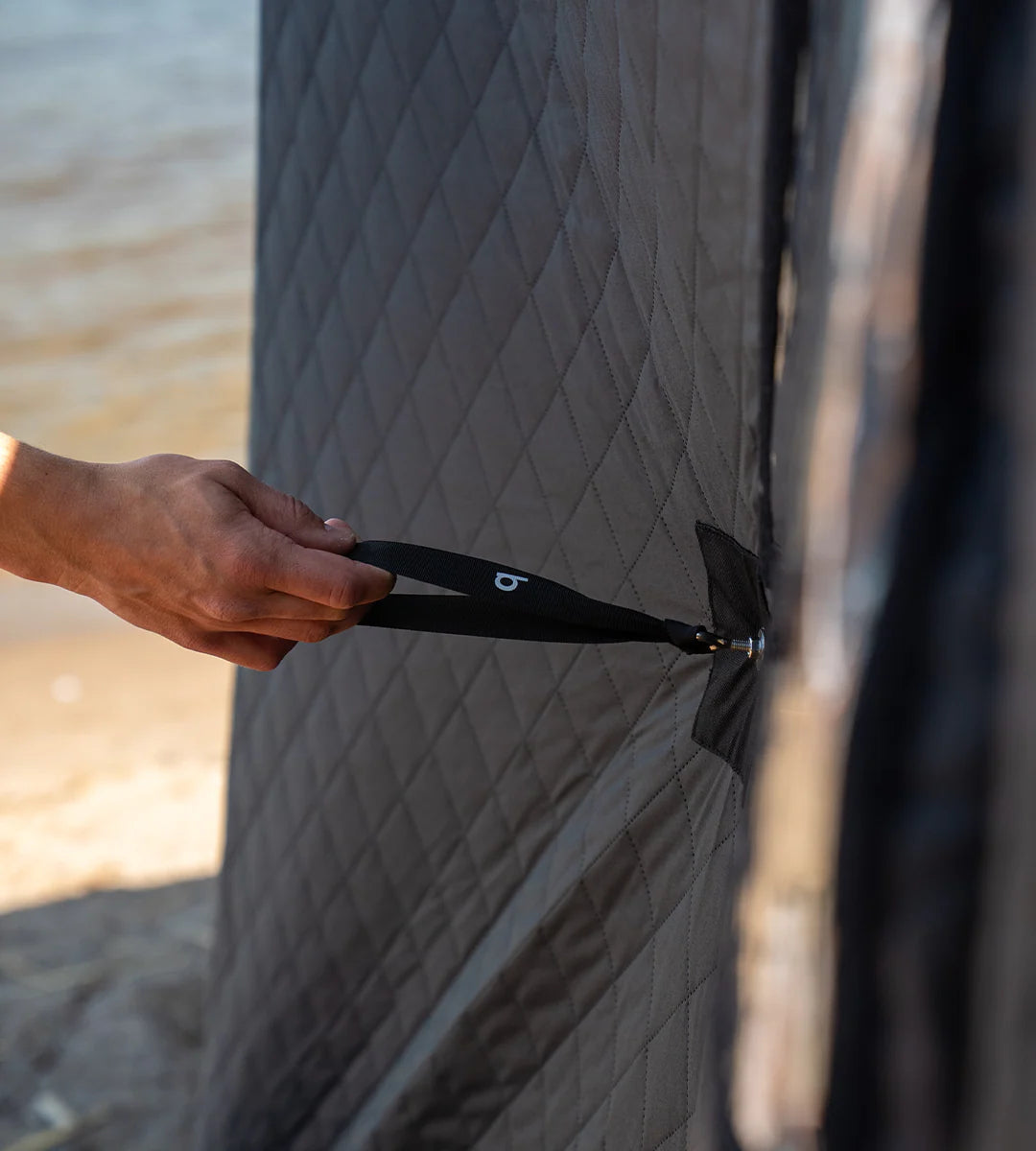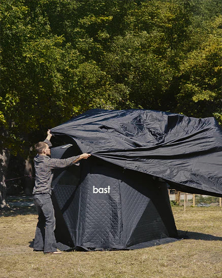 Veðurvörnin verndar saunatjaldið gegn rigningu, raka og UV-geislun. Hún stuðlar að lengri líftíma efnisins og er sérstaklega gagnleg þegar tjaldið stendur uppi yfir lengri tíma.